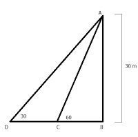1. Saurabh was standing in his society’s apartment at point D and watching the top of his building, which makes an angle of elevation of 30 º. Saurabh then walked some distance towards his building and then his angle of elevation to the top of tower becomes 60 º. If the height of the building is 30 meters, find the distance he moves.