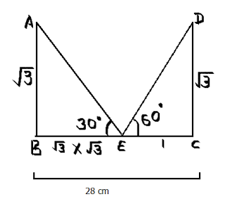 8.Two towers of equal height are standing opposite to each other on either side of a pavement which is 28 meters wide. From a point between them on the road, the angles of elevation of tops of the towers are 30 º and 60 º respectively. Find the height of the tower.