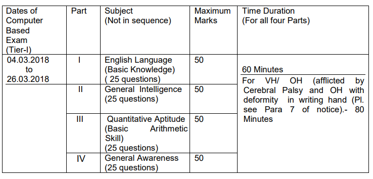 Date of Computer Based Examination (Tier-I): 04.03.2018 to 26.03.2018