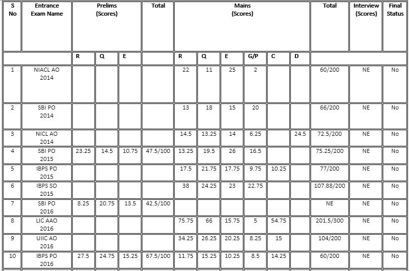 Now, keeping it short, I will let you know about the exams in which I appeared. Please have a brief look at the below table which include the number of exams appeared and scores obtained by me. I am a General category candidate (though I don’t support caste-based system)